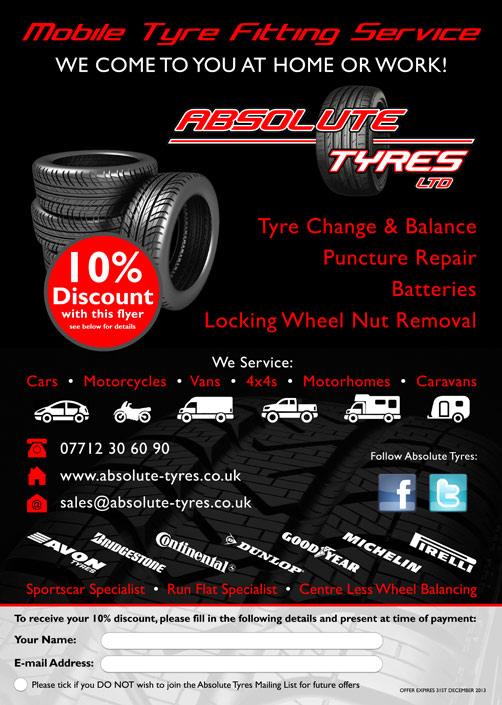 Absolute Tyres provide a mobile tyre fitting service in and around the Doncaster area of South Yorkshire.