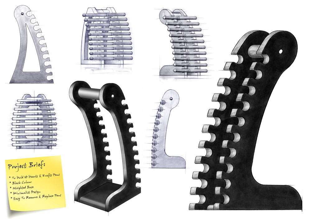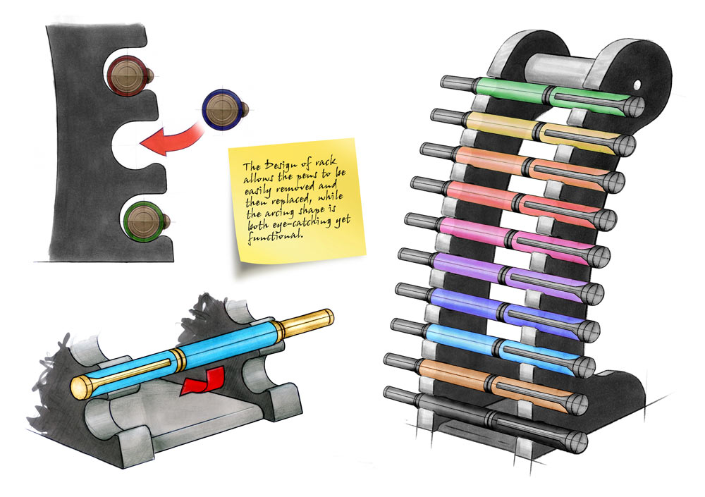 The brief was for a simple rack that would hold 10 pens from their extensive range in an eye-catching manor, yet allow them to be easily removed for closer inspection.